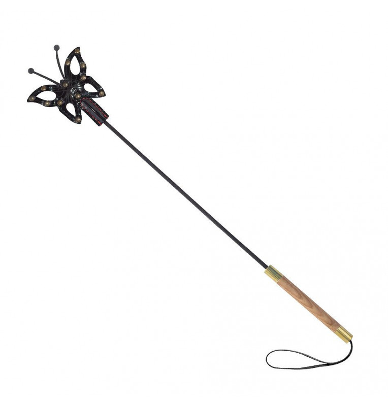 Основа стека - гибкий и прочный углепластик с черным нейлоновым плетёным покрытием. Гладкая и удобная цилиндрическая рукоять изготовлена из кавказского ясеня, обладает натуральным светло-коричневым цветом с красивой естественной текстурой. С обеих сторон ручка декорирована элементами из ювелирной латуни. Рукоять имеет удобную черную кожаную петлю для фиксации изделия на запястье (темляк). Окончание-хлопушка выполнено в виде черной бабочки с красной прошивкой с декоративным узором и резиновыми усиками. Оно изготовлено из натуральной итальянской лаковой кожи, украшенного бронзового цвета заклепками из ювелирной латуни. Внутри хлопушки находится эластичная вкладка-амортизатор для придания достаточной красности и гибкости.
