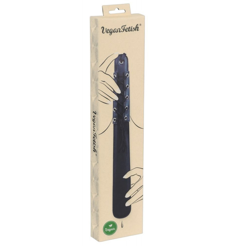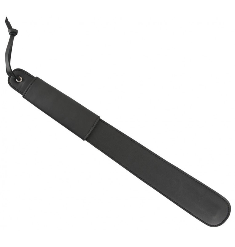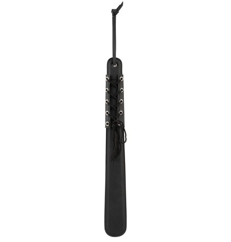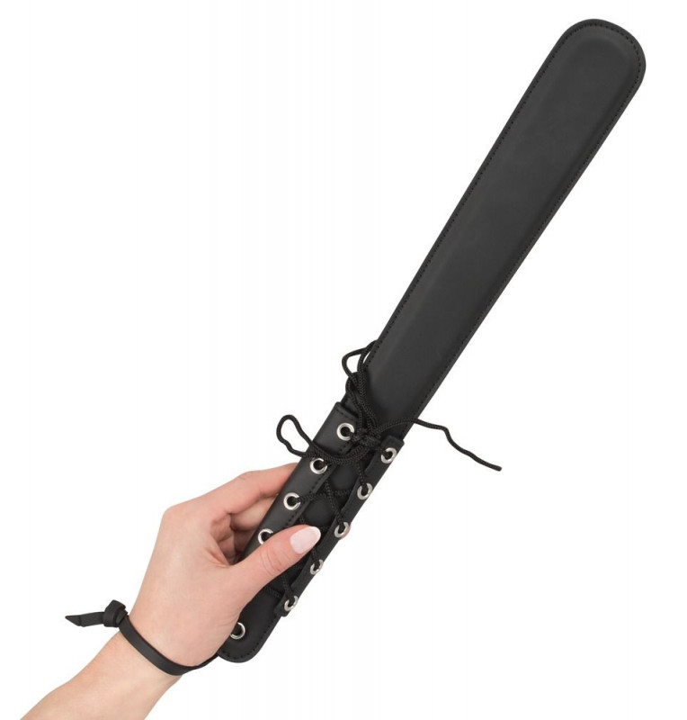 Модель сочетает в себе оригинальный дизайн и эргономичную форму. Стильная шлепалка с широкой пластиной для нанесения ударов изготовлена из мягкого полиуретана и имеет удобную петлю для руки, а ее массивная рукоять украшена велюром и шнуровкой. Для дополнительной прочности края девайса прошиты нитью.