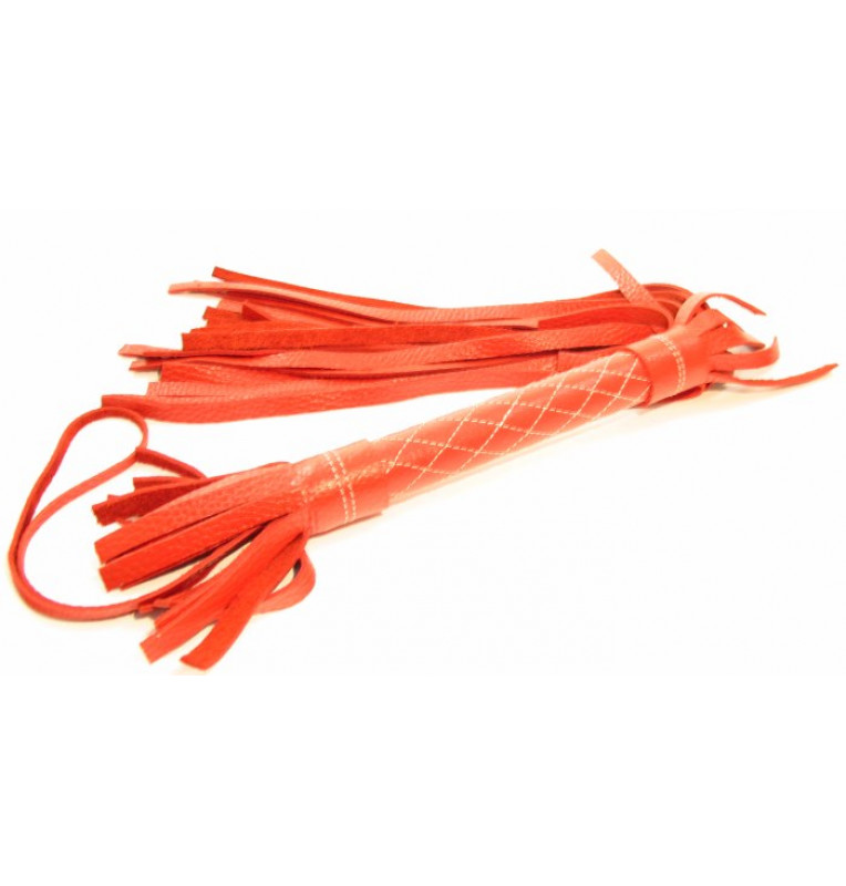 Аккуратная красная плетка, изготовленная из натуральной кожи. Имеет жесткую ручку, также покрытую кожей и простроченную белыми нитями. Имеется петля для удобного использования плети. Длина ручки - 17 см. Длина хлыстов - 27 см.