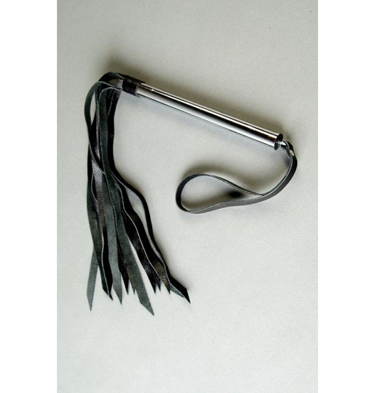 Плеть узкая, ручка металлическая, длинная, чёрная. Стильная плеть ручной работы имеет короткий хвост, состоящий из тридцати полос мягкой кожи. К узкой металлической ручке прикреплена петля, позволяющая надежно фиксировать плеть в руке. Длина ручки - 20 см.
