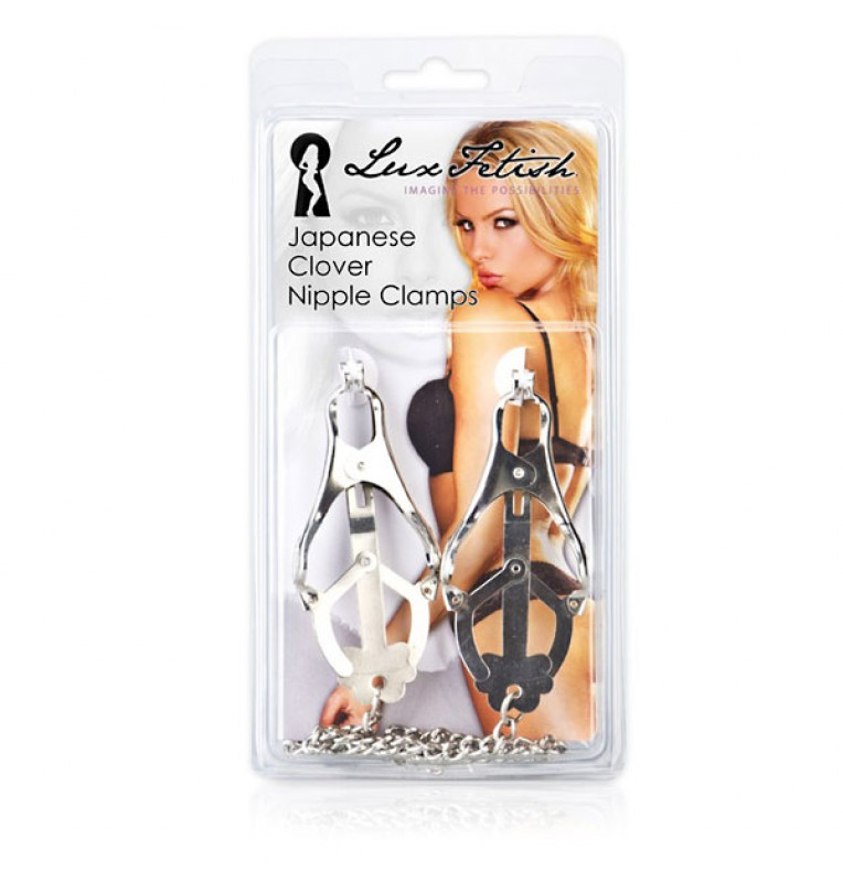 Необычные металлические зажимы на соски с красивым декоративным элементом в виде клевера, который двигается при разжатии клипсов. Клипсы соединены между собой металлической цепочкой. Сами зажимы покрыты мягким пластиком, чтобы не повредить кожу сосков.