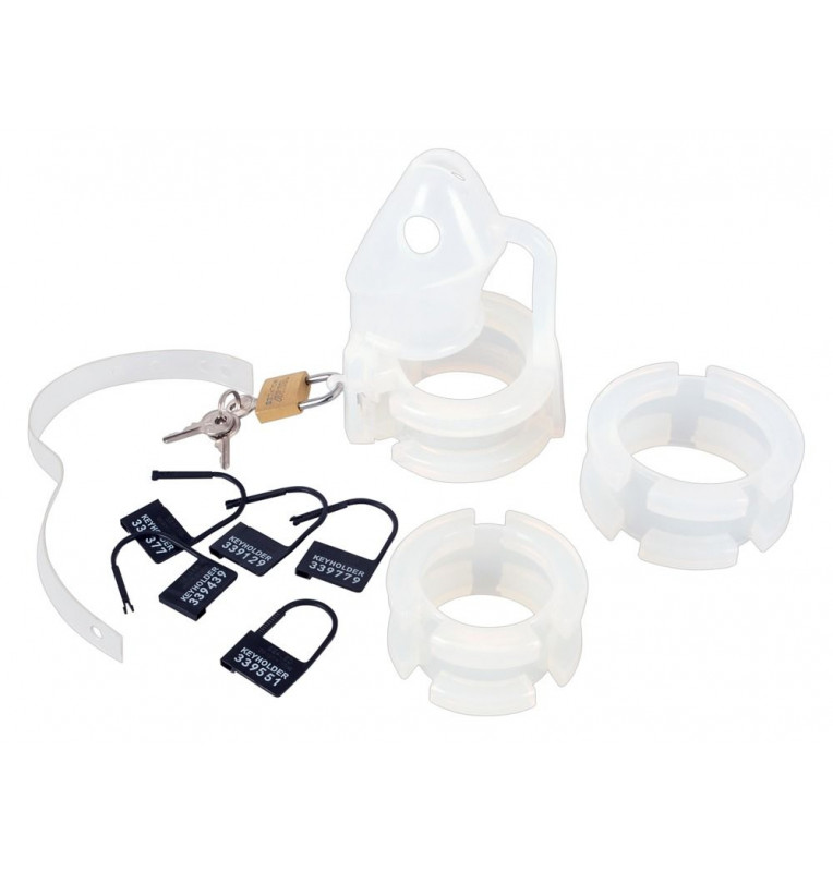 Набор для мужского пояса верности Cock Cage Set. Состоит из клетки, 3 колец, 2 фиксаторов, замка с 3 ключиками и 5 шильдиков. Клетка имеет отверстие для мочеиспускания. Длина клетки - 7 см., диаметр - 3,5 см. Диаметр колец - 4,1, 4,8 и 5,2 см.