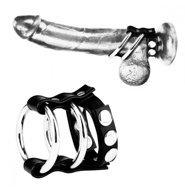 Эти регулируемые кольца с защелкивающимся клепочным ремнем прижимает член и мошонку, удерживая пенис металлическим кольцом.