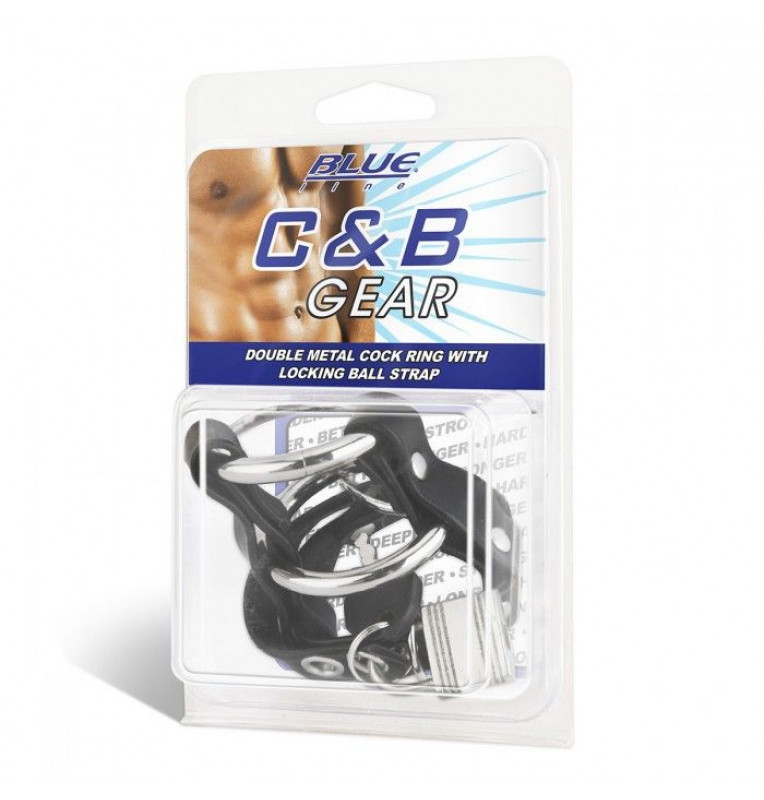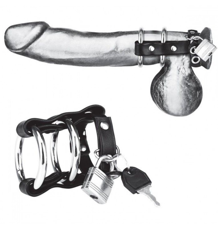 Заблокируй и сдави! Этот запираемый кожаный и металлический замок для члена предназначен для удержания эрекции, сжимает пенис и мошонку, удерживая член металлическим кольцом.