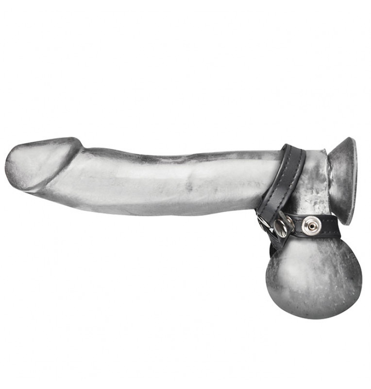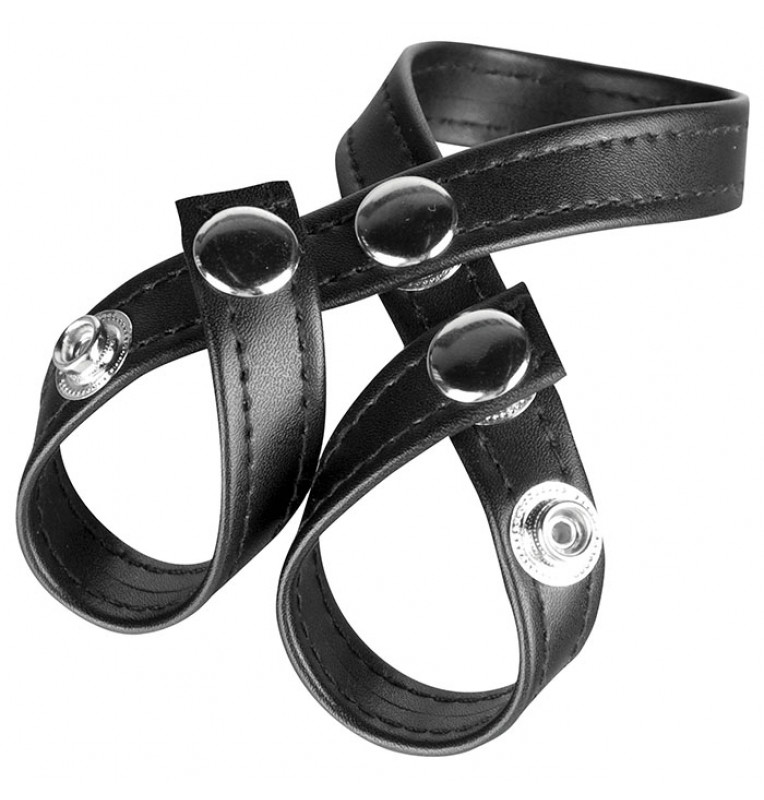Разделитель мошонки из качественный искусственной кожи на клепках. Данный аксессуар крепится на основании полового члена имеет две петли для фиксации яичек. Он обеспечивает дополнительную стимуляцию мошонки и фиксирует ее во время полового акта. Диаметр петель для яичек от 2,7 до 3,5 см. Упаковка: Блистер.