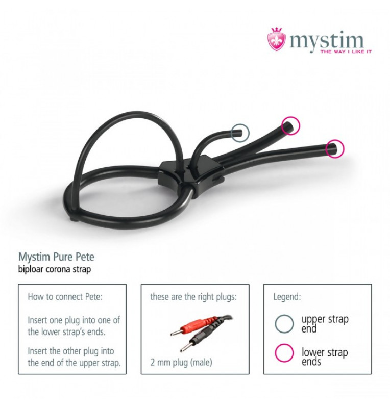 Это чёрное лассо, выполненное из электропроводного материала (силикон с добавлением платины), плотно сожмёт головку вашего члена. Стоит вам включить электростимулятор MyStim, чтобы импульсные токи стали дразнить вашу плоть, усиливая возбуждение до максимума.