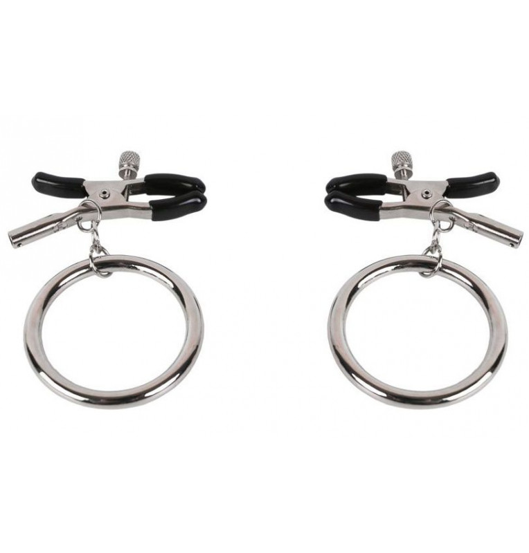 Аксессуар, который поможет вам обострить ощущения во время игры БДСМ. Зажимы на соски – теперь о стимуляции этой чувствительной зоны можно забыть. Зажимы всё сделают сами! Зажимы украшены свободно свисающими кольцами. Сила зажима регулируется винтами. Диаметр колец - 4,5 см.