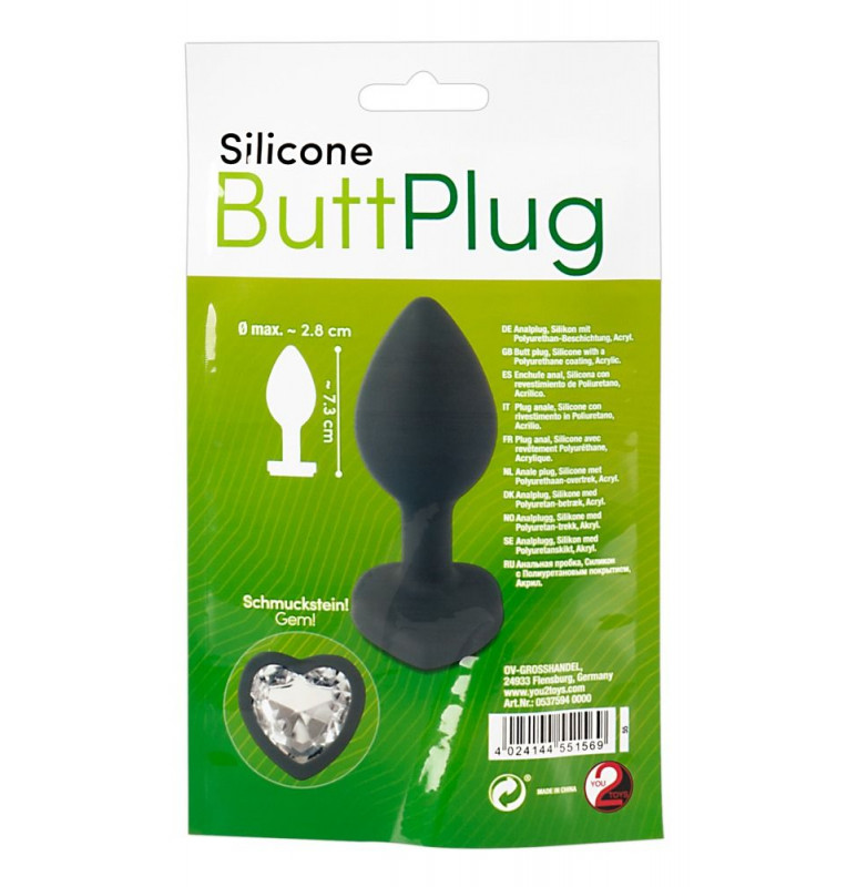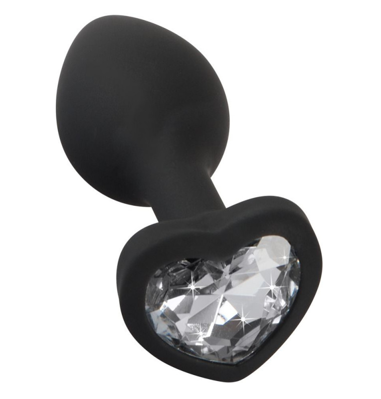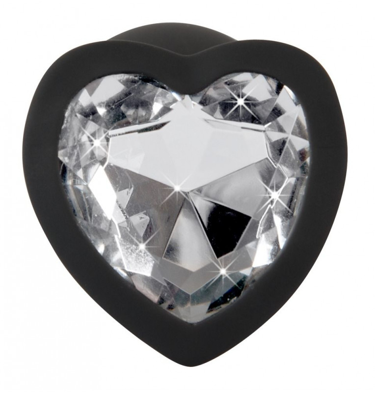 Черная силиконовая анальная пробка с прозрачным стразом-сердечком - 7,3 см.