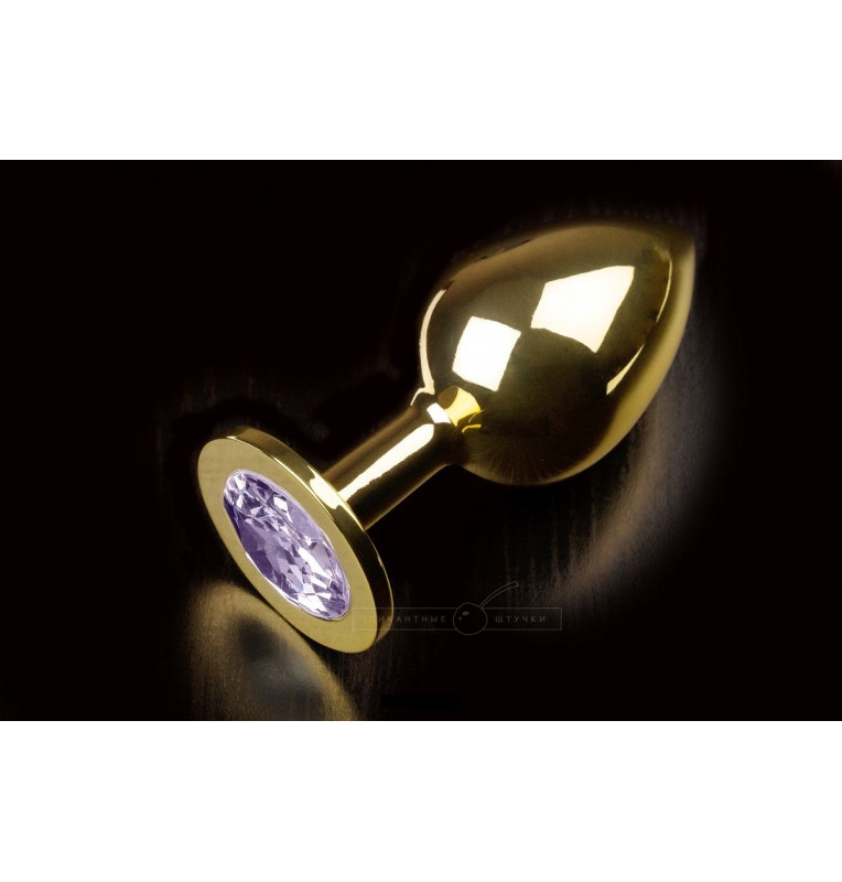 Большая золотая анальная пробка с закругленным кончиком и сиреневым кристаллом - 9 см.
