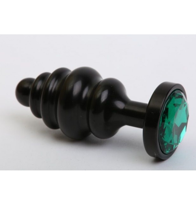 Чёрная ребристая анальная пробка с зеленым кристаллом - 7,3 см.