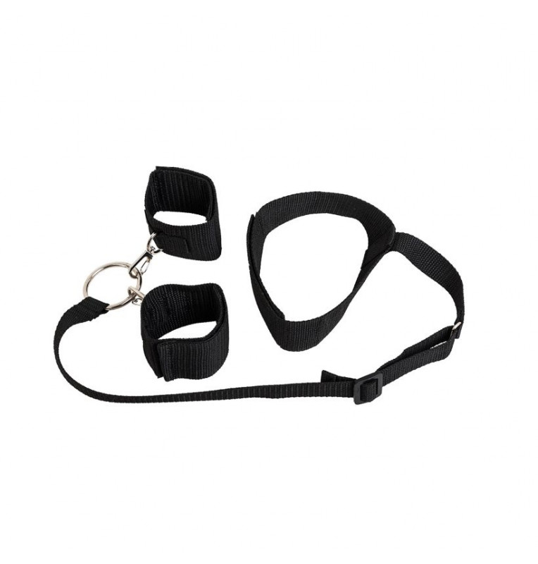 Черный ошейник с длинной лентой и отстегивающимися наручниками