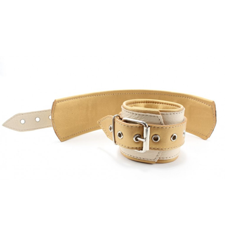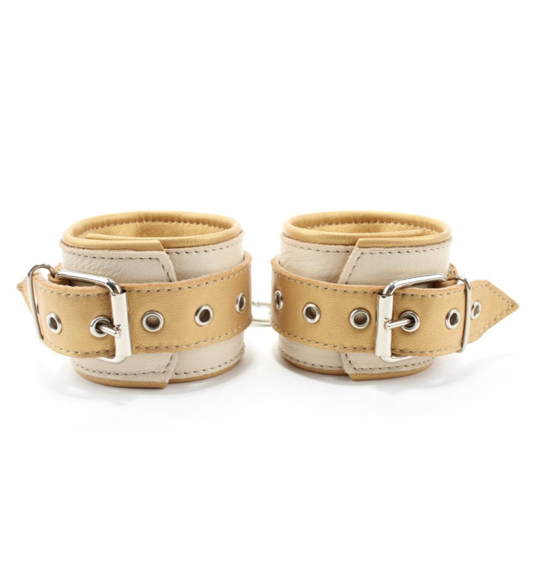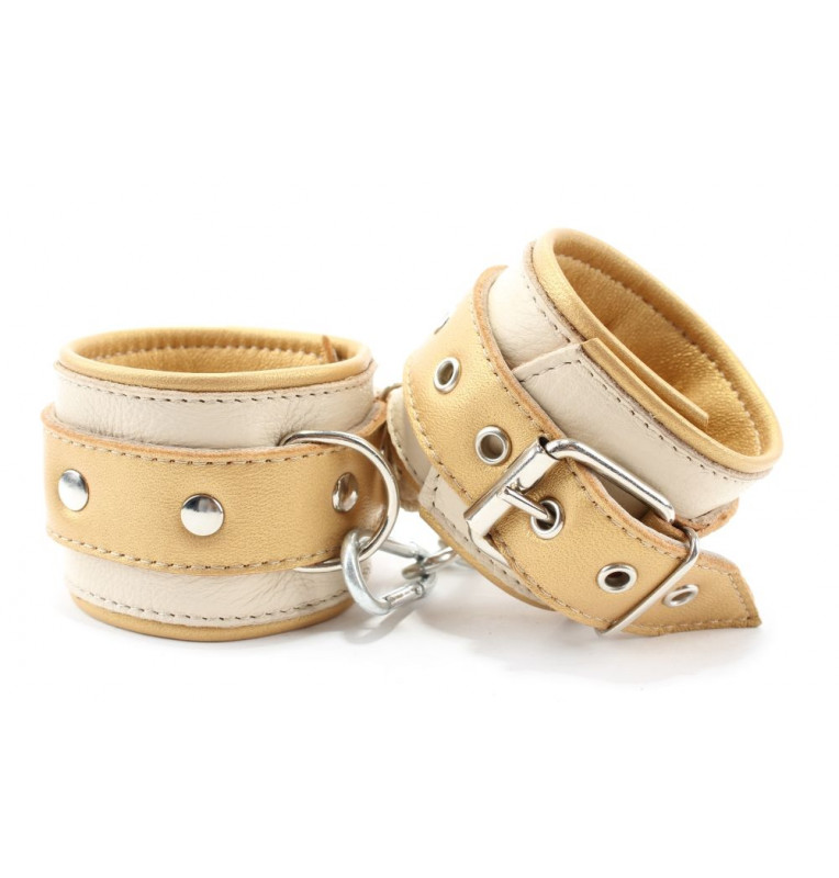Наручники из натуральной кожи бежевого цвета с золотистой отделкой из нежной перчаточной кожи. Сварная металлическая фурнитура и цельный хлястик для надежной фиксации. Ширина - 6 см.