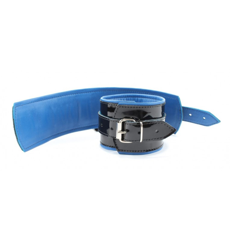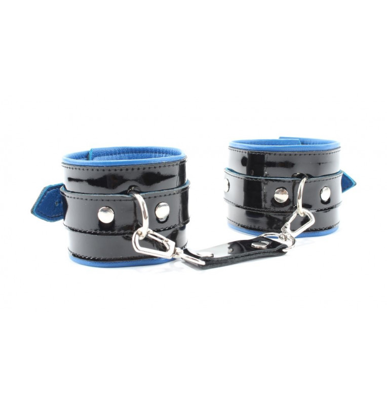 Наручники из натуральной кожи с лаковым покрытием, Подклад из нежной кожи контрастного синего цвета. Сварная металлическая фурнитура и цельный хлястик для надежной фиксации. Ширина - 6 см.