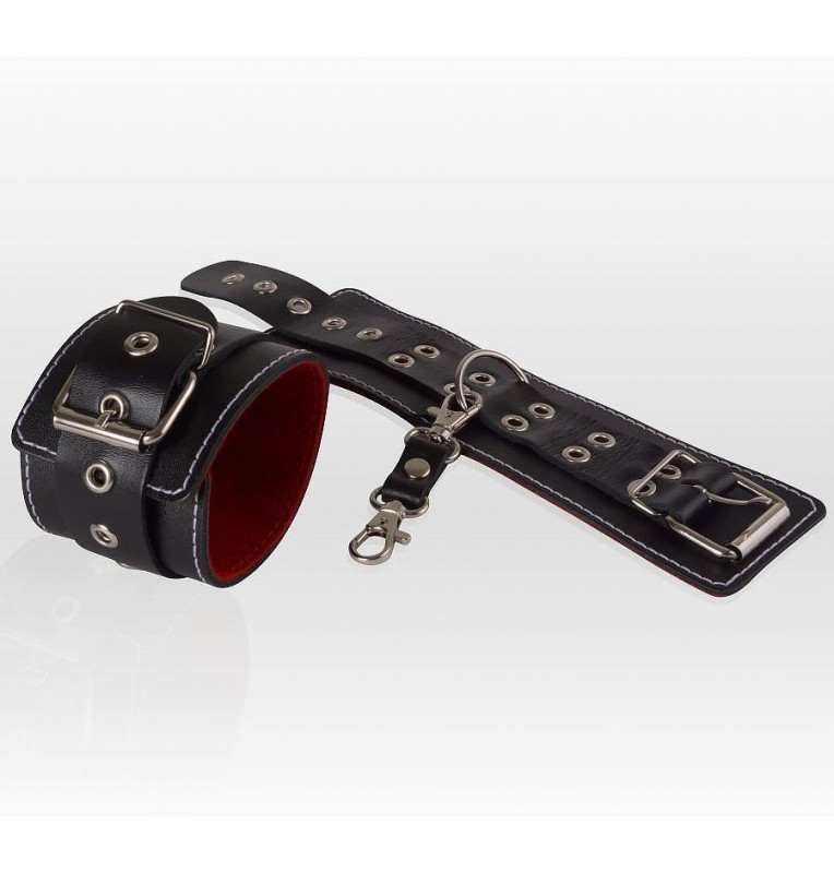Чёрные кожаные наручники с контрастной строчкой и красной изнанкой.