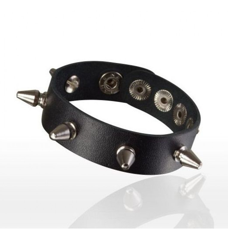 Узкий браслет из плотной натуральной высококачественной кожи черного цвета, украшенный пятью серебристыми металлическими шипами, не только является атрибутом для эротических ролевых игр и практик БДСМ, но и стильным украшением для ношения. Ширина - 2 см.