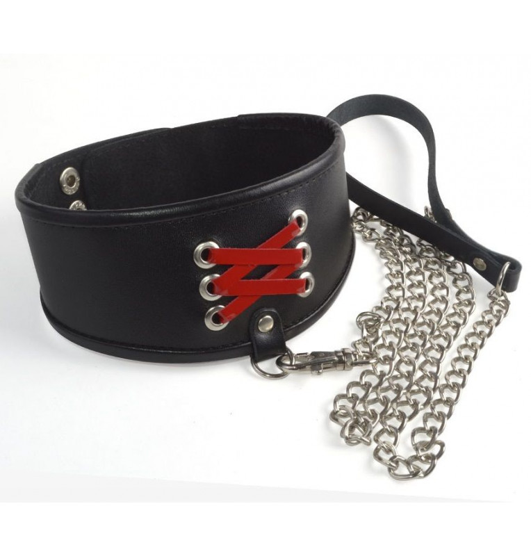 Широкий ошейник из плотной натуральной высококачественной кожи черного цвета, украшенный контрастной шнуровкой из красных лаковых лент. Для максимального комфорта ошейник имеет мягкую велюровую подкладку и оторочку по краю. Изделие имеет эргономичный дизайн – более широкий спереди и сужающийся к застежке. На внешней части у застежки внизу под шнуровкой имеется небольшое D-образное колечко, за которое можно зацепить входящий в комплект поводок в виде металлической цепочки с фиксацией с помощью кожаной петли на запястье. Ширина - 6,5 см. Длина поводка - 80 см.