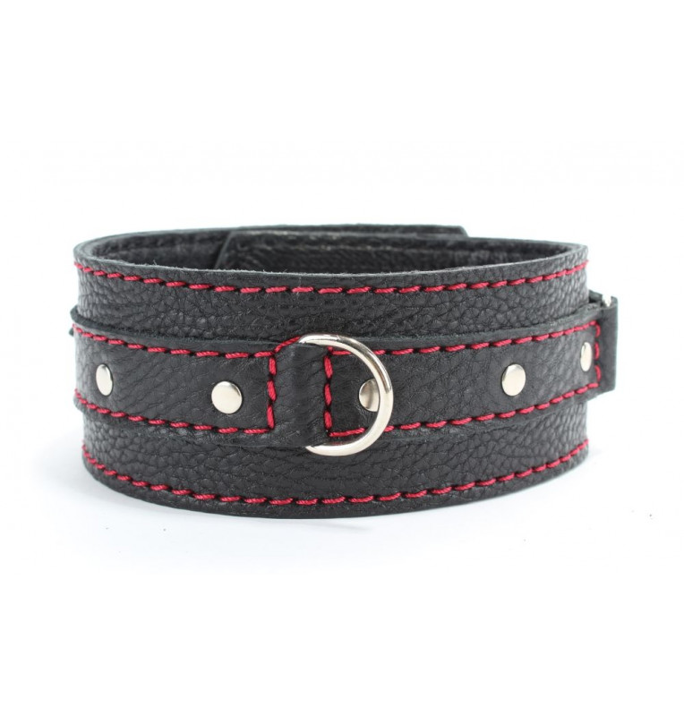 Черный ошейник из натуральной кожи с красной строчкой и заклепками