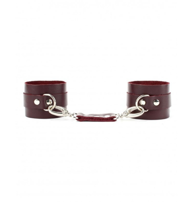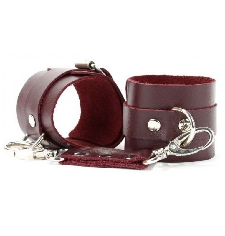 Оковы выполнены из натуральной кожи. Металлическая пряжка крепко удерживает в подчинении, кожаное соединение на карабинах фиксирует наручники вместе, ремни позволяю выбрать нужный размер. Стильный аксессуар поможет воплотить эротические фантазии в реальность.