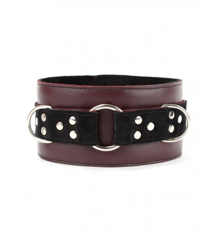 Ошейник выполнен из натуральной кожи, декорирован вставкой из замши, заклепками, металлическим кольцом и двумя полукольцами. Сзади аксессуар надежно фиксируется пряжкой, ремень позволяет выбрать нужный размер. Мягкий подклад из замши обеспечит комфортное пребывание в аксессуаре.