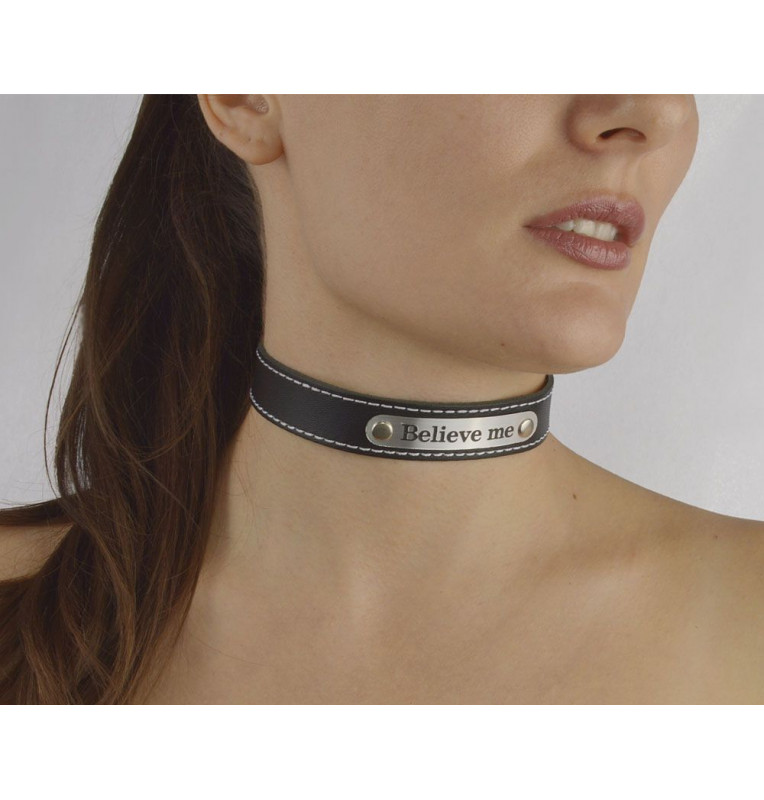 Чокер изготовлен из натуральной кожи и дополнен вставкой под металл с надписью Believe me. Регулируется при помощи кнопок.