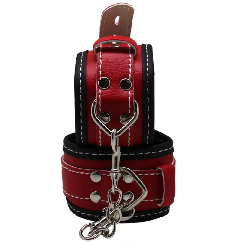 Наручники Eroticon — высококачественное изделие с современной фурнитурой, аккуратными креплениями и отличной контрастной белой строчкой. Изготавливаются из натуральной кожи c покрытием, которое сохраняет свойство натуральной кожи пропускать воздух и устойчивость к деформации, но в отличии от натуральной кожи имеет более привлекательный внешний вид .Яркие наручники сшиты на велюровой подкладке. Между слоем кожи и велюровой подкладкой проложена дополнительно мягкая прокладка для более комфортного использования в БДСМ-играх. Соединяются наручники между собой короткой цепочкой с двумя карабинами на концах. Они не нарушают кровообращение и обеспечивают надёжную фиксацию с помощью пары замков. Размер регулируется при помощи ремешков. Ширина - 5 см.