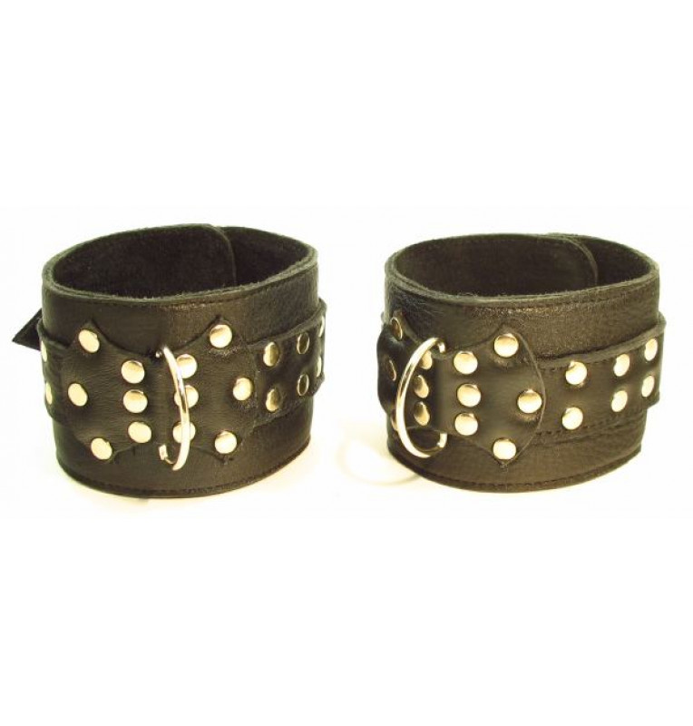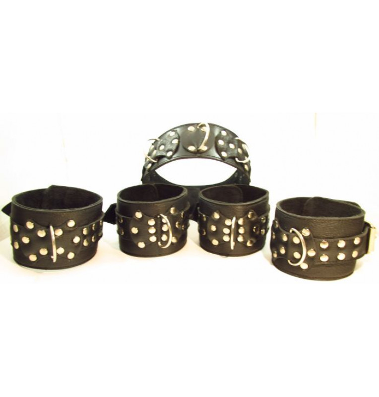 Набор аксессуаров, изготовленных из натуральной кожи. В него входят: наручи и поножи, украшенные заклепками, которые можно соединять и комбинировать между собой при помощи цепей с карабинами (входят в комплект) Размер меняется при помощи застежки. Также имеется черный ошейник с одним кольцом. Размер регулируется застежками на кнопках. Ширина наручников и поножей - 6 см. Ширина ошейника - 4,5 см.