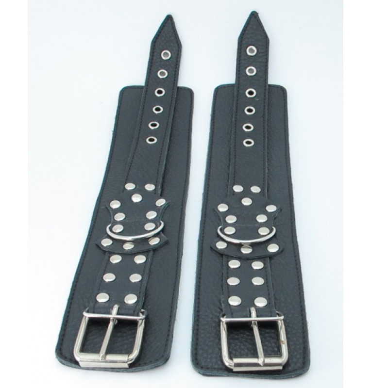 Кожаные наручники черного цвета. Украшены заклепками и соединяются между собой цепью с карабинами. Размер наручников регулируется при помощи застежки Ширина - 6 см. Длина цепочки - 15,5 см.