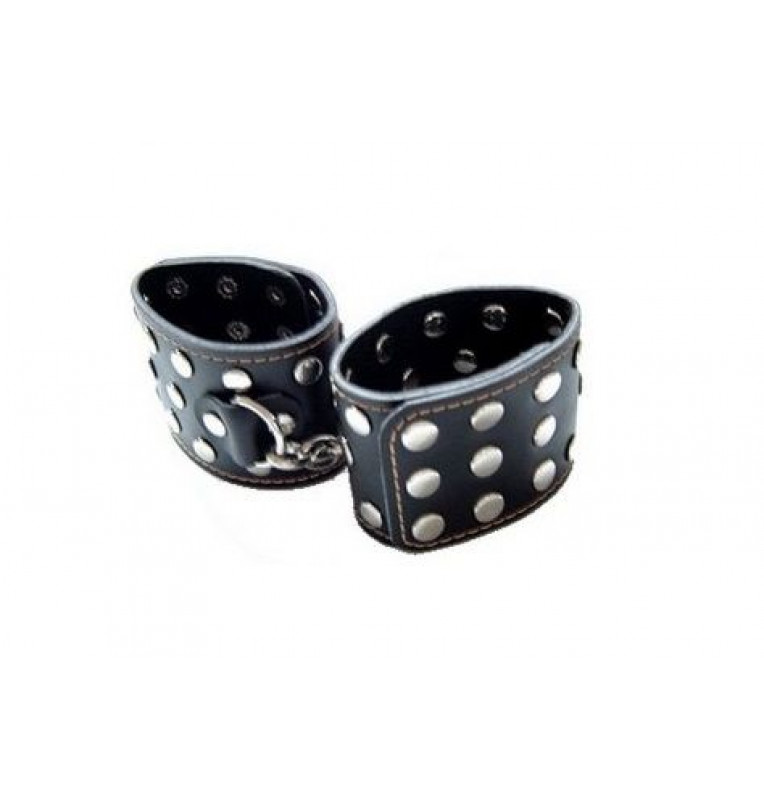 Шикарные манжеты, которые могут выполнить роль как украшения, так и полноценных фиксаторов на руки и ноги. Широкие манжеты изготовлены из кожзаменителя и по всей поверхности декорированы хромированными заклёпками. По размеру атрибут регулируется кнопками. Манжеты снабжены D-кольцами и карабином. При желании движения партнера можно ограничить, скрепив манжеты и образовав наручники, или зафиксировав его у кровати или стула.