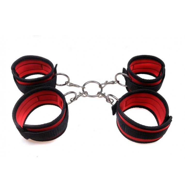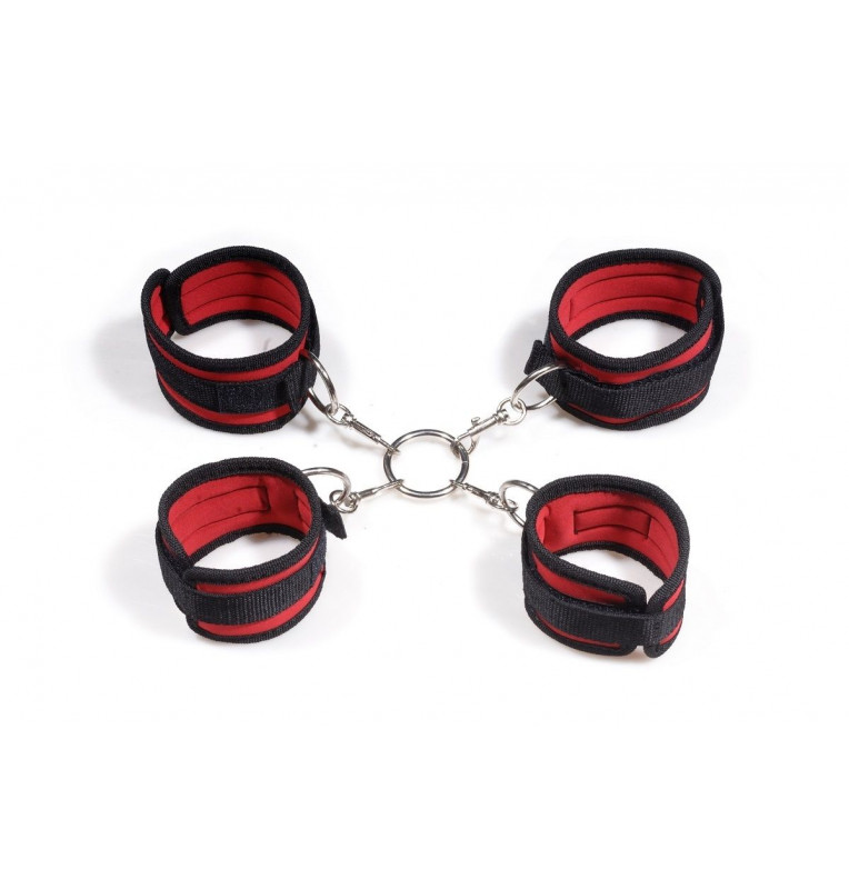 Оригинальный атрибут, который позволит вам зафиксировать своего партнера в определенной позиции. Хотите, чтобы он прогнулся и повернулся к вам спиной? А, может, пусть лучше поднимет высоко ноги и руки? В любом из случаев вам необходимы эти фиксаторы! Две пары мягких манжет, соединенные между собой кольцом, позволят вам ограничить движения своего партнера. Манжеты на липучках сделаны из красно-черного нейлона. При желании любую из манжет можно отстегнуть. Бренд: Пикантные штучки