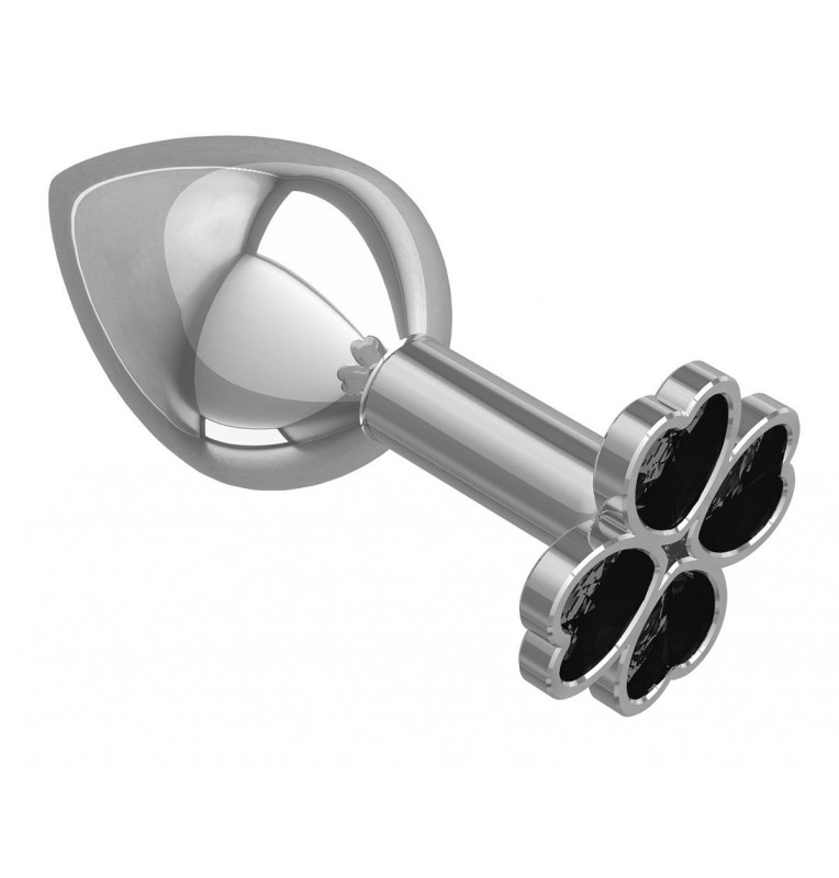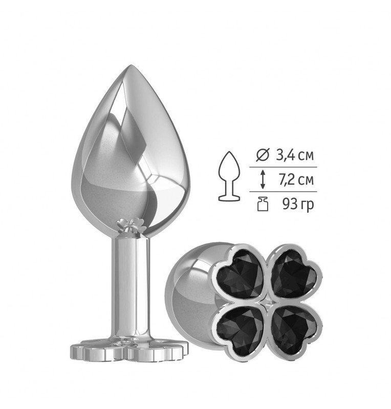 Средняя серебристая анальная втулка с клевером из черных кристаллов - 8,5 см.