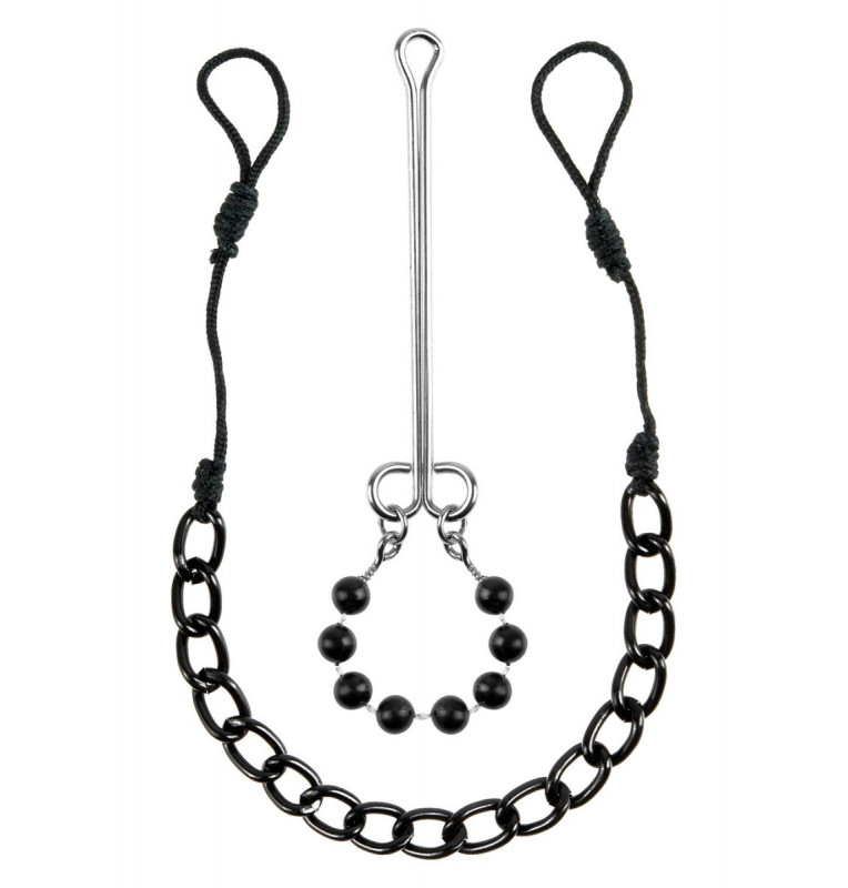 Набор, состоящий из украшения на грудь в виде цепочки (крепится на соски при помощи петли-лассо) и зажима на клитор с бусинами.