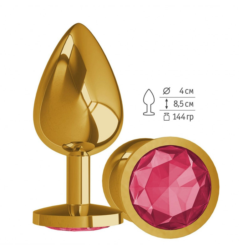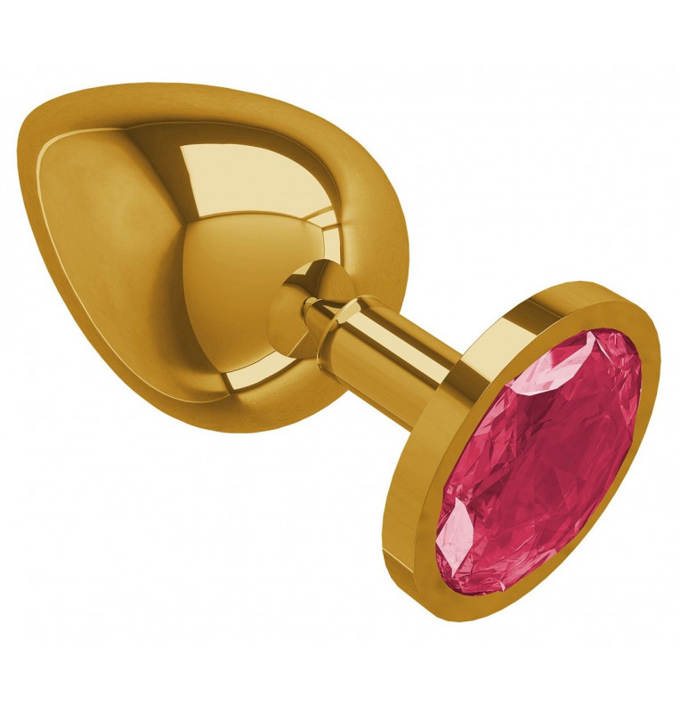 Золотистая большая анальная пробка с малиновым кристаллом - 9,5 см.