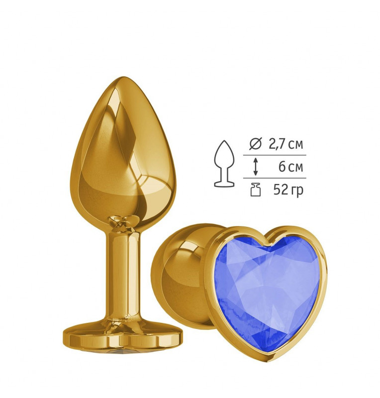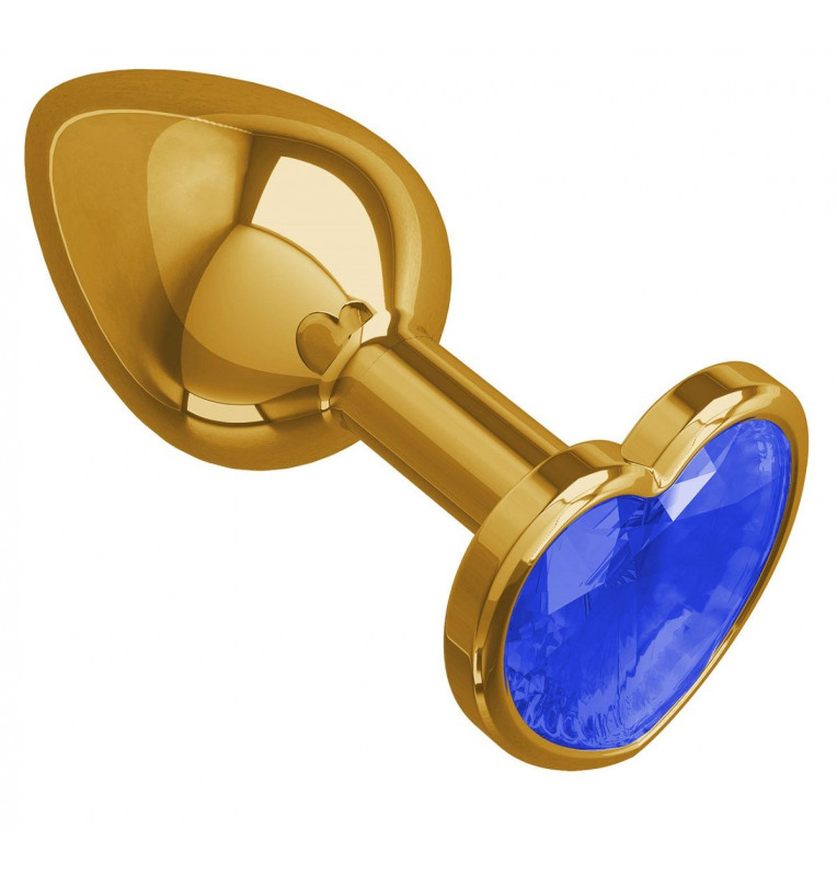 Золотистая анальная втулка с синим кристаллом-сердцем - 7 см.