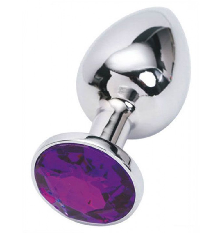 Серебристая анальная пробка из металла с фиолетовым стразом - 7 см.