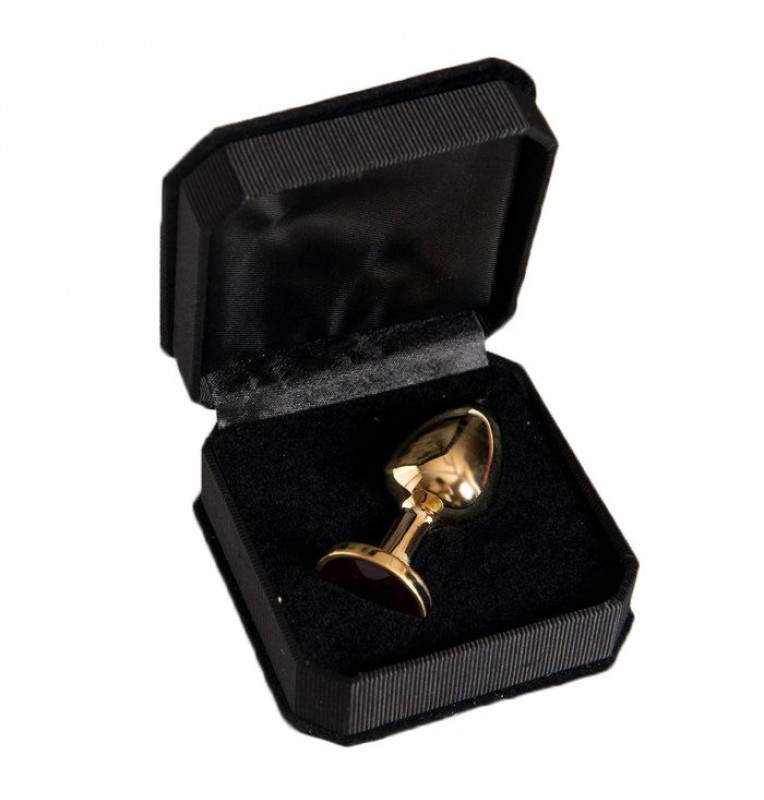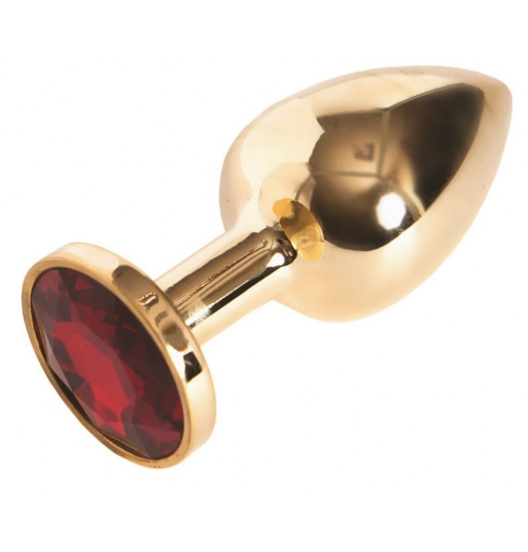 Малая золотистая анальная втулка с красным кристаллом. Поставляется в подарочной упаковке.