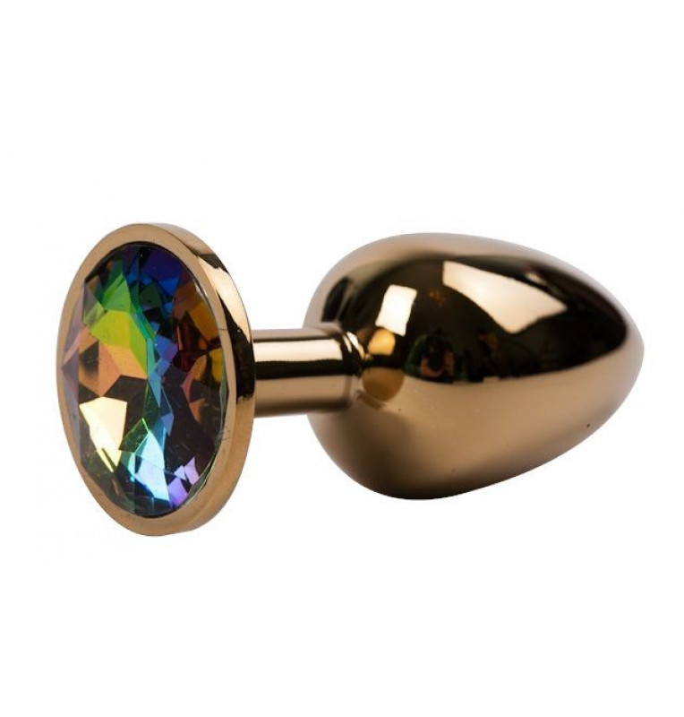 Золотистая металлическая анальная пробка с радужным стразом - 7,6 см.