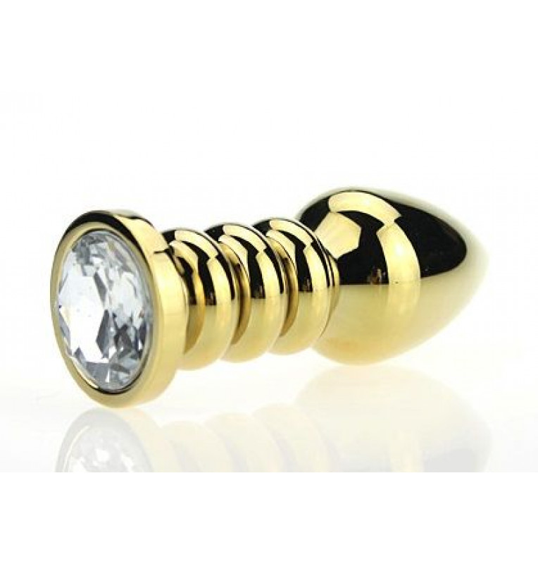 Золотистая фигурная анальная пробка с прозрачным стразом - 10,3 см.