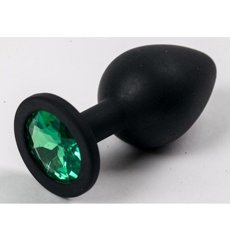 Черная силиконовая анальная пробка с зеленым стразом - 8,2 см.