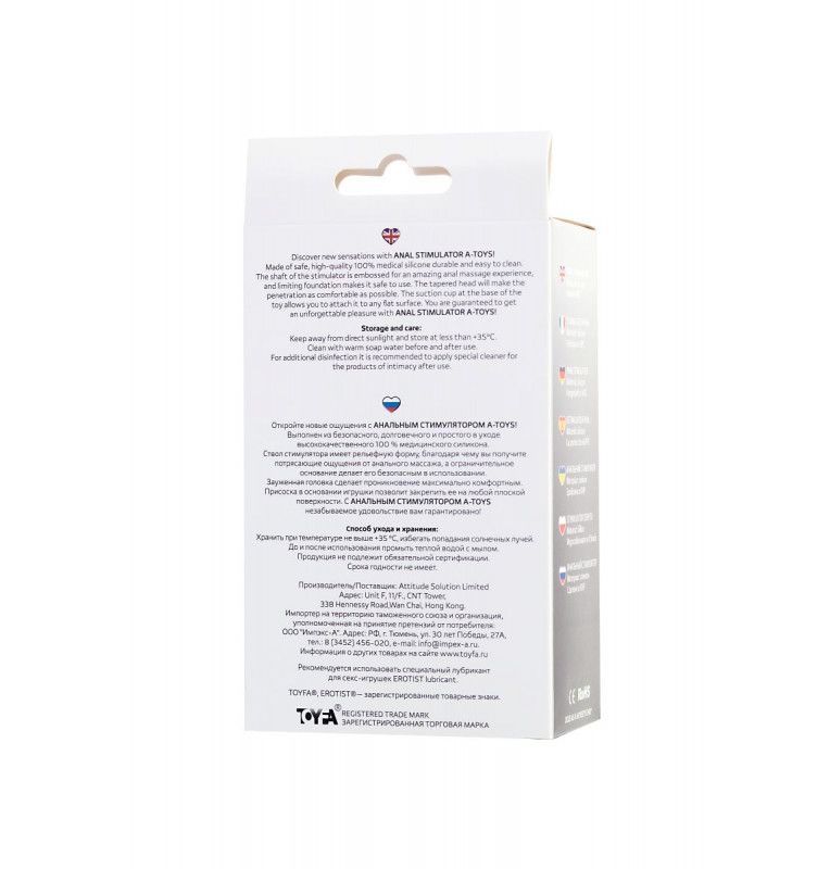 Откройте новые ощущения с анальным стимулятором A-Toys! Она выполнена из безопасного, долговечного и простого в уходе высококачественного 100 % медицинского силикона. Ствол стимулятора имеет рельефную форму, благодаря чему вы получите потрясающие ощущения от анального массажа, а ограничительное основание делает ее безопасной в использовании. Зауженная головка сделает проникновение максимально комфортным. Присоска в основании игрушки позволит закрепить ее на любой плоской поверхности. С анальным стимулятором A-Toys незабываемое удовольствие вам гарантировано! Рабочая длина – 11,5 см.