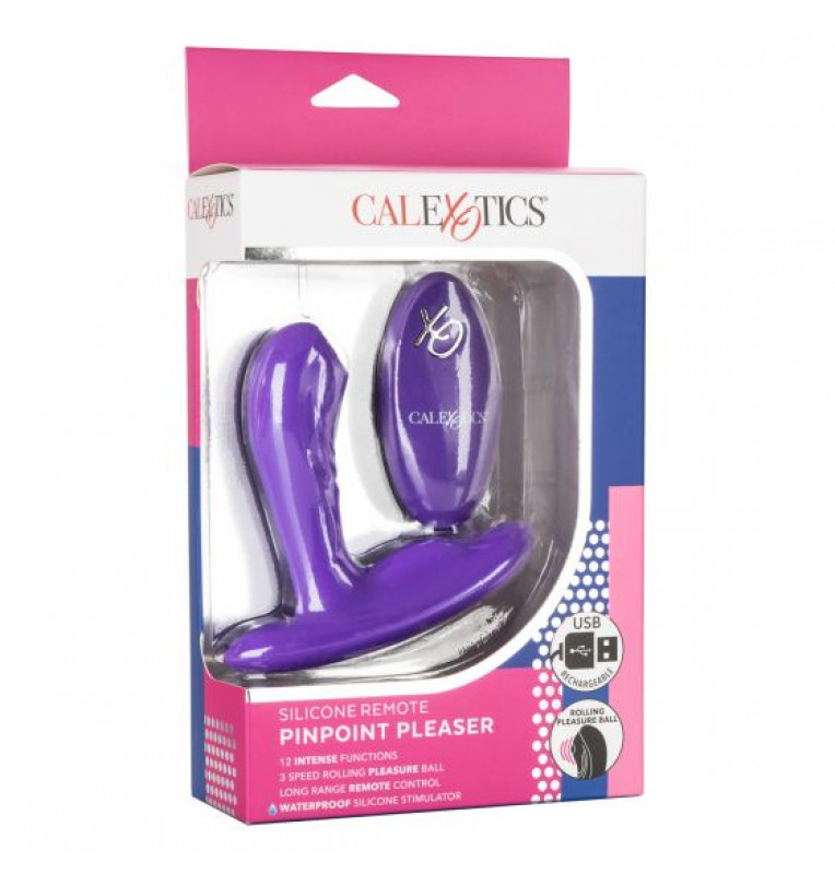 Фиолетовый вибромассажёр простаты Silicone Remote Pinpoint Pleaser. 12 функций вибрации управляются при помощи пульта ДУ. 3 скорости движения шарика в головке. Рабочая длина - 7,25 см.