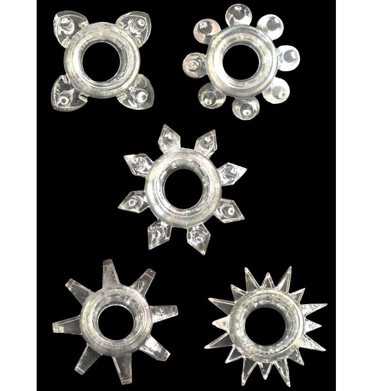 Набор из 5 эрекционных колец для более яркого удовольствия. Игрушка задерживает отток крови из члена, из-за чего эрекция длится дольше. Использовать это можно не только в сексе с партнершей, но и во время мастурбации – тренируйте выносливость и усиливайте собственные ощущения! Кольца эластичные и легко растягиваются до нужного размера. Внутренний диаметр - 1,5 см.