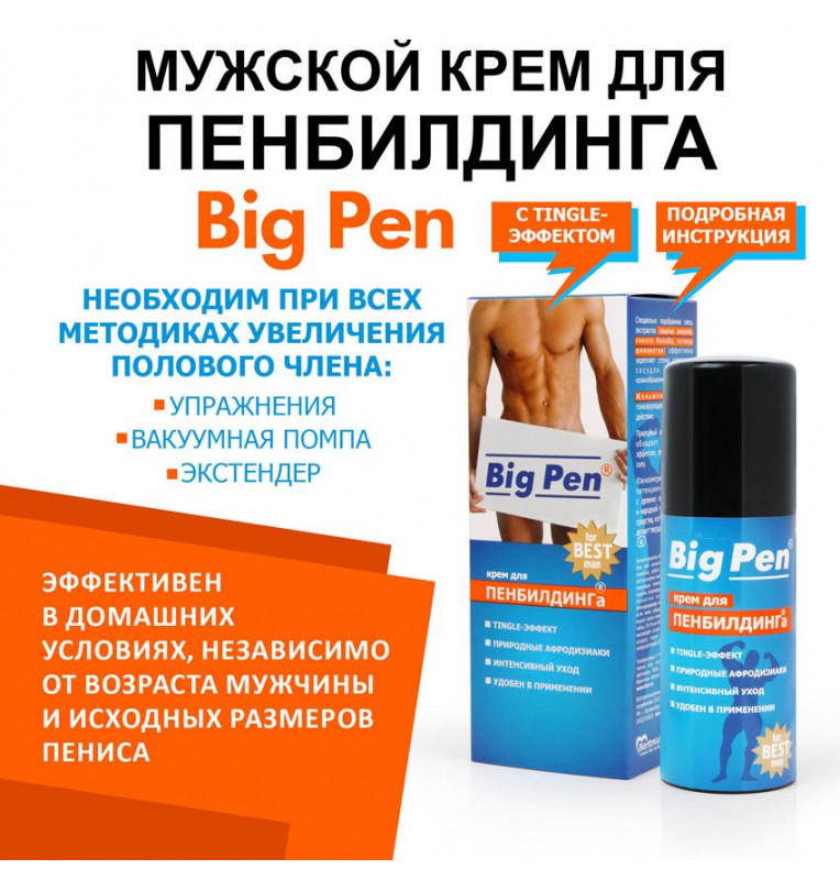 Чтобы пенбилдинг, то есть механическое растяжение пениса до желаемых размеров, был эффективным, рекомендуется использовать специальные средства. Такие, как этот крем Big Pen. Сочетая в себе скольжение масла и упругость крема, Big Pen обеспечивает отличное увлажнение кожи. С ним пенбилдинг, например, при помощи вакуумной помпы, будет как никогда комфортным и действенным! Препарат стимулирует: усиление полового влечения хорошую эрекцию в любом возрасте длительные и интенсивные оргазмы быстрое восстановление либидо формирование требуемой формы члена коррекцию кривизны полового органа.
