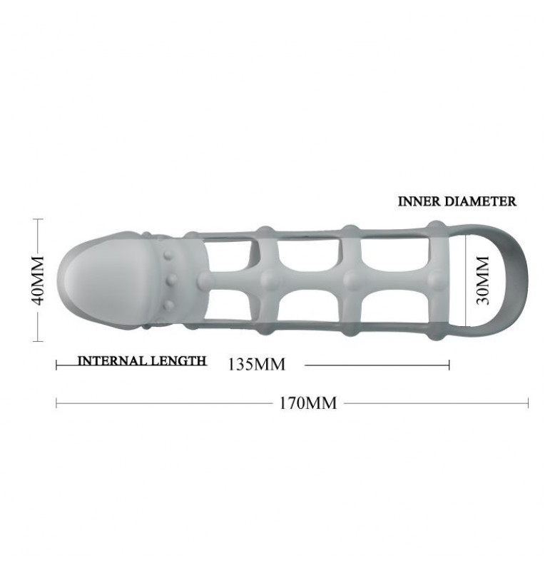 Эта закрытая насадка на пенис не только придает дополнительный рельеф члену, но и выполняет функцию эрекционного кольца, так как силикон плотно обхватывает ствол, а подхват мошонки надежно удерживает насадку и немного сжимает мошонку. Рабочая длина - 13,5 см.