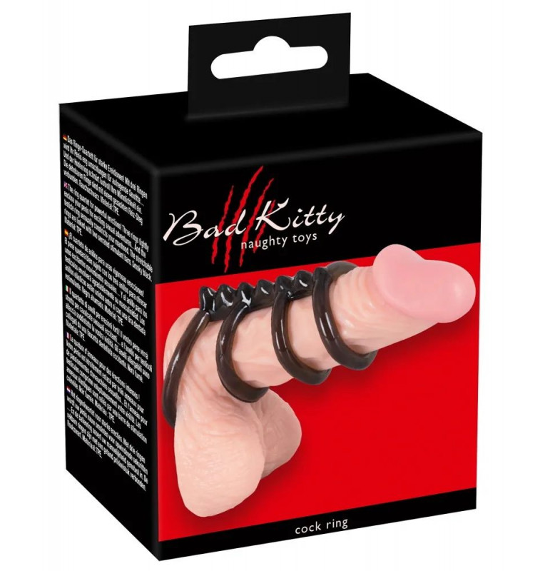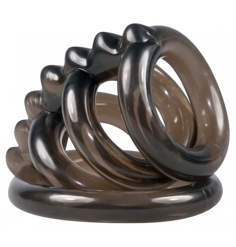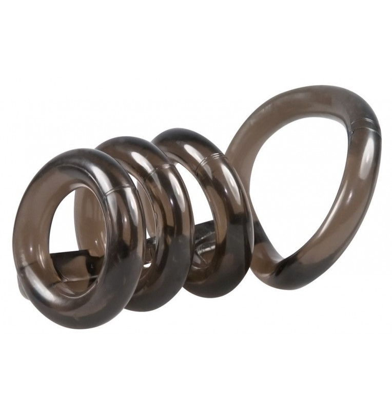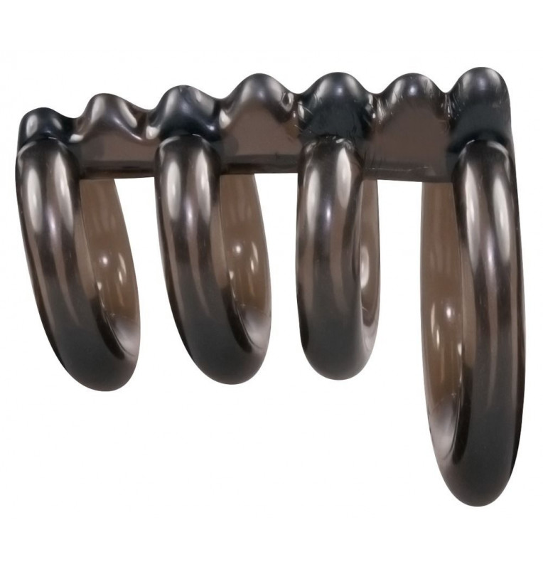 Дымчатая стимулирующая насадка на пенис из 4 колец. Четыре эрекционные кольца – четыре грани удовольствия. Насадка предназначена для предотвращения преждевременного семяизвержения, для более стойкой эрекции и для дополнительной стимуляции партнерши. Диаметр 3 малых колец - 2,3 см. Диаметр большого кольца - 4,3 см. Толщина каждого кольца - 0,8 см.