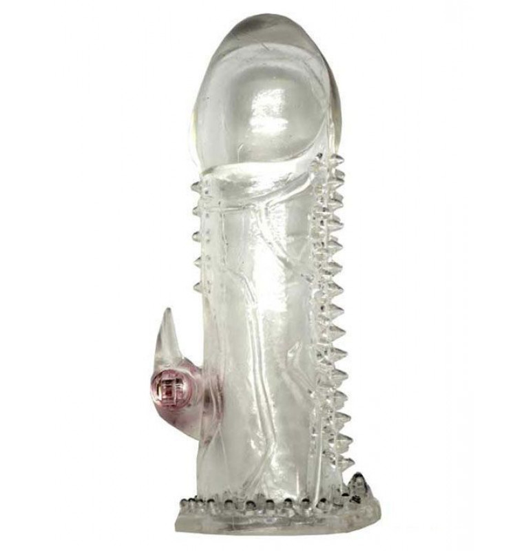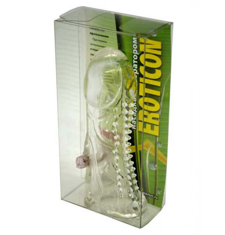 Насадка с вибратором, прозрачная. Насадка надевается на основание фаллоса, находящегося в состоянии эрекции, для увеличения размера и усиления ощущений партнера. Батарейки в комплекте (2хLR44).