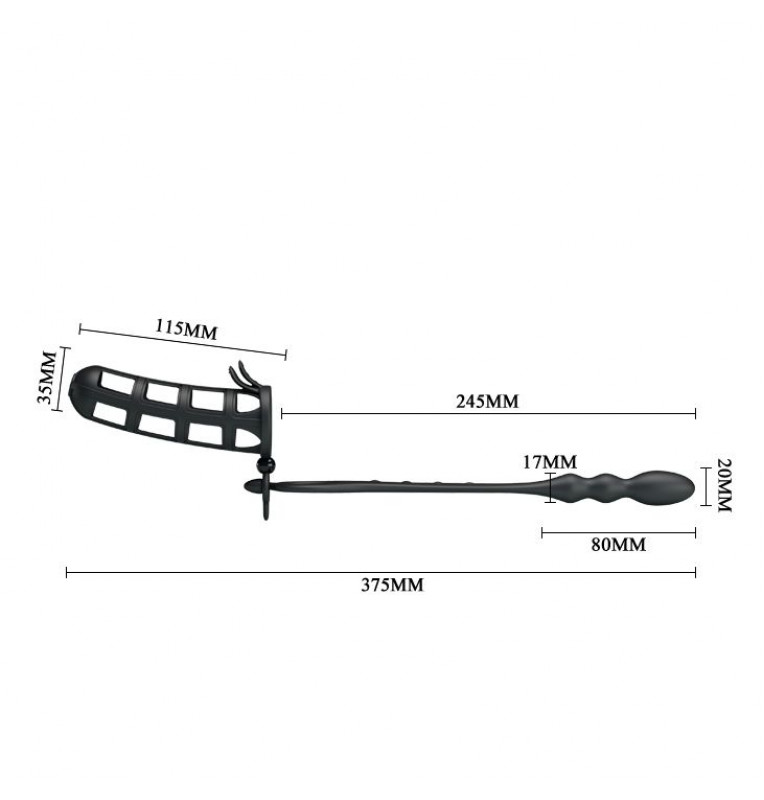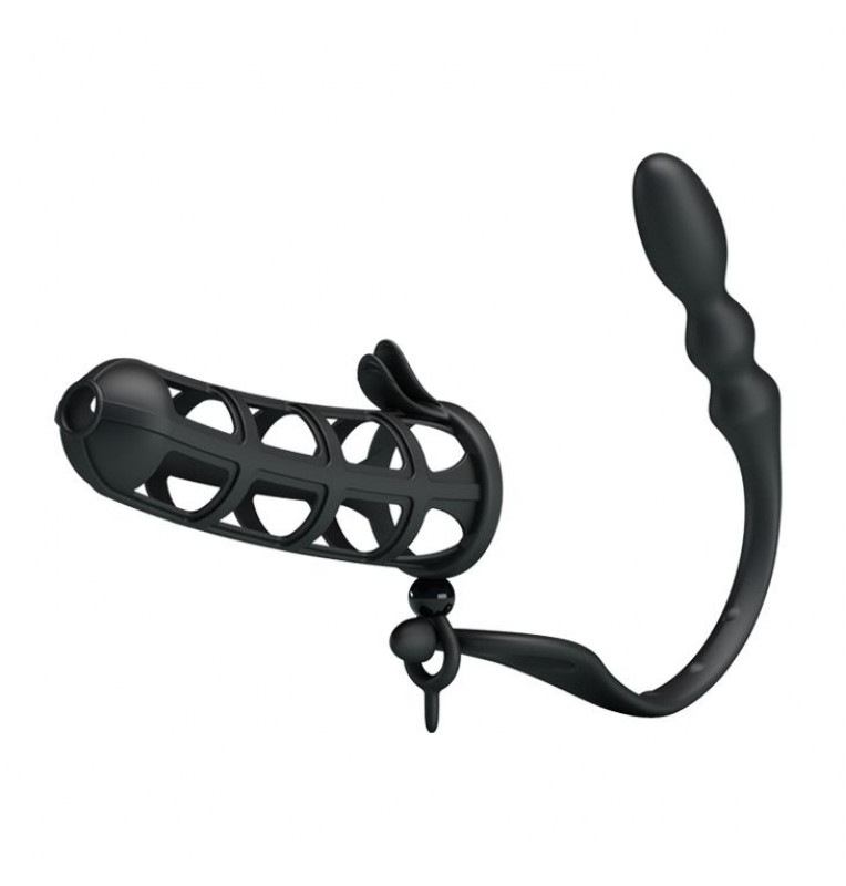 Закрытая силиконовая насадка на пенис и ребристый анальный стимулятор могут быть использованы как вместе, так и по отдельности. Выполнены в строгом чёрном цвете из нежного силикона. Рабочая длина насадки - 11,5 см., диаметр - 3,5 см. Длина анального хвоста - 24,5 см. Рабочая длина анального хвоста - 8 см., диаметр - 2 см.