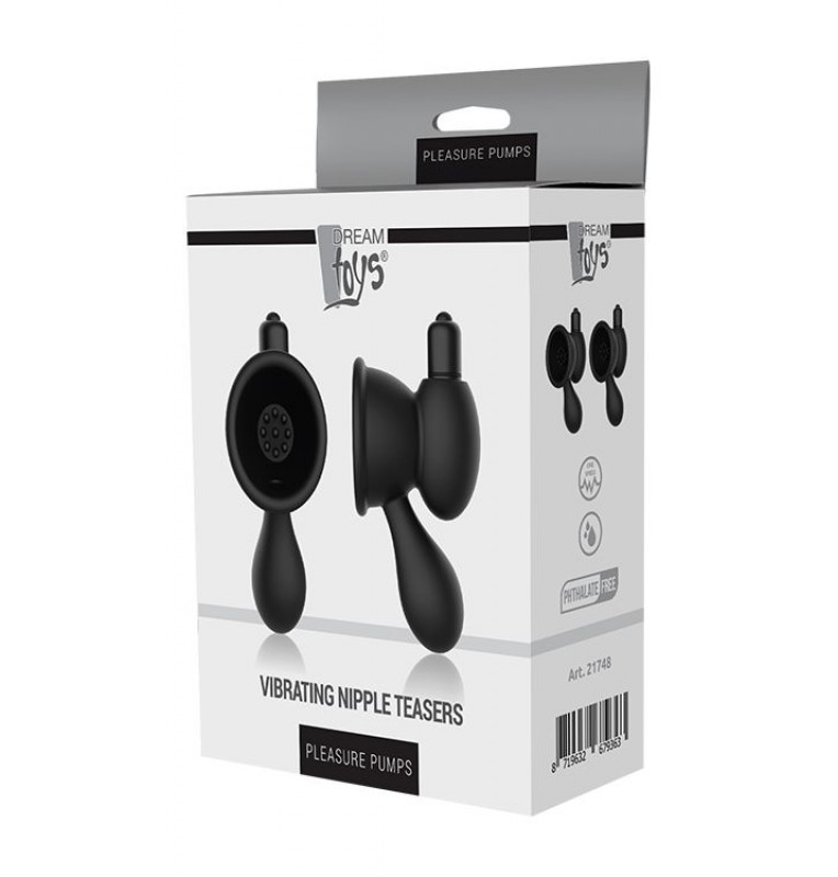 Черные вибронакладки для сосков VIBRATING NIPPLE TEASERS. С помощью груши фиксируются на сосках. Включение виброэлементов способно раздразнить вас до предела!