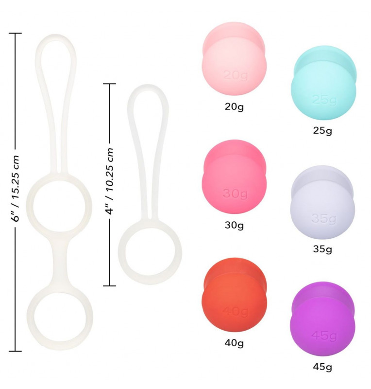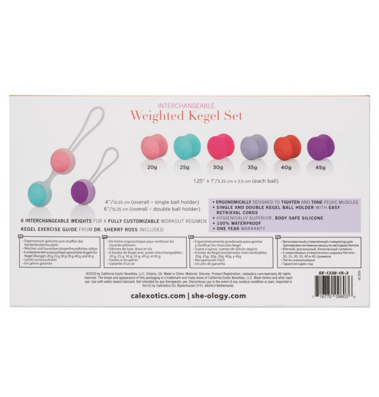 Набор сменных утяжелителей Кегеля She-ology – один из самых удобных наборов для оптимальной результативной поэтапной тренировки и прокачки мышц тазового дна. Набор из 6 шаров Кегеля с регулируемым весом, созданный для обеспечения полностью настраиваемого режима тренировки, можно смешивать и сочетать с одинарным или двойным держателем шаров, чтобы дать мышцам именно то, что им нужно. Набор грузов включает шары по 20 г, 25 г, 30 г, 35 г, 40 г и 45 г. Силиконовый набор премиум-класса безопасен для тела, не содержит запаха и фталатов. Идеальные вагинальные тренажеры для повышения тонуса интимных мышц и снизить вероятность болезней мочеиспускательной системы. Миниатюрные веса работают на увеличение сексуального возбуждения, создание тонуса и укрепление мышц таза. Проработка ключевых вагинальных мышц снижает риск заболеваний тазового дна или недержания мочи, одновременно увеличивая эротическое удовольствие. Удобный шнурок позволяет легко извлечь тренажер при необходимости в любой момент. Для комфортности введения и получения максимально приятных ощущений рекомендуем использовать смазку на водной основе. Очищать игрушку желательно до и после использования. Можно помыть в теплой воде с мылом или воспользоваться специализированным чистящим средством. Перед хранением шарики необходимо хорошо просушить. Желательно хранить отдельно от других силиконовых изделий. В комплекте: 2 держателя, 6 шариков. Длина двойного держателя - 15,25 см., одинарного - 10,25 см. Вес шариков - 20 гр., 25 гр., 30 гр., 35 гр., 40 гр., 45 гр.
