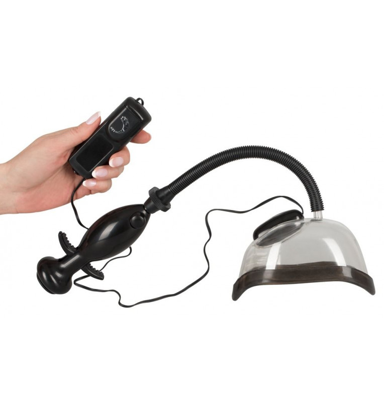 Вакуумная помпа анатомической формы со съемной вибропулей и удобным насосом. Вибрацией можно управлять с помощью проводного пульта.Также имеется выпускной клапан. Ширина помпы - 8,5 см., глубина - 6,2 см. Длина вибропули - 5,5 см., диаметр - 2,5 см.
