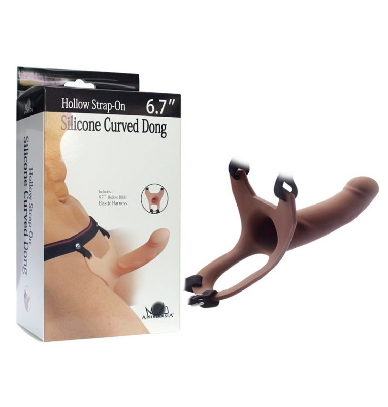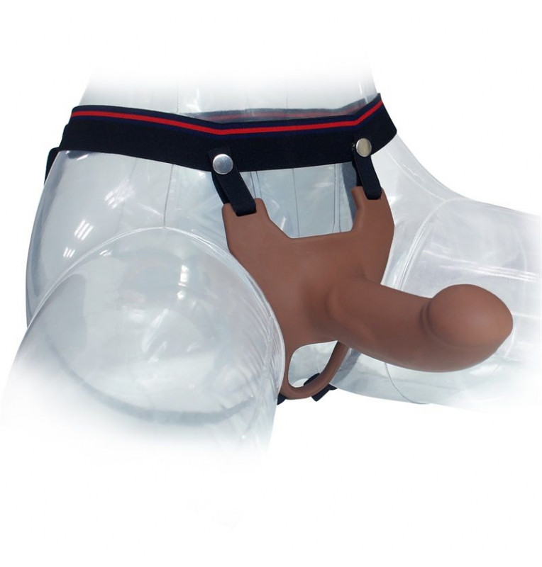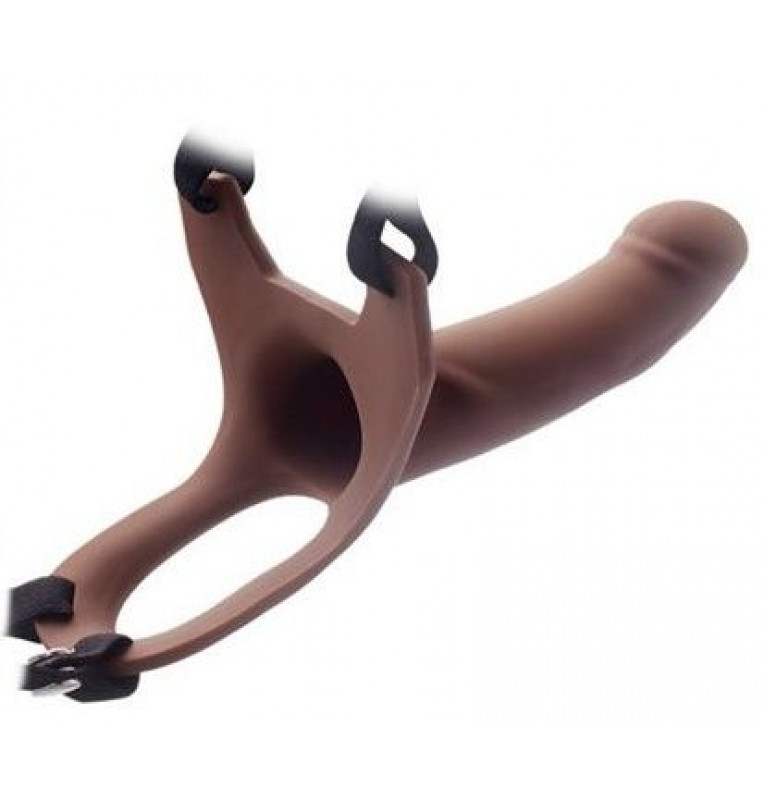 Коричневый полый фаллопротез на черных лентах - 15,5 см.